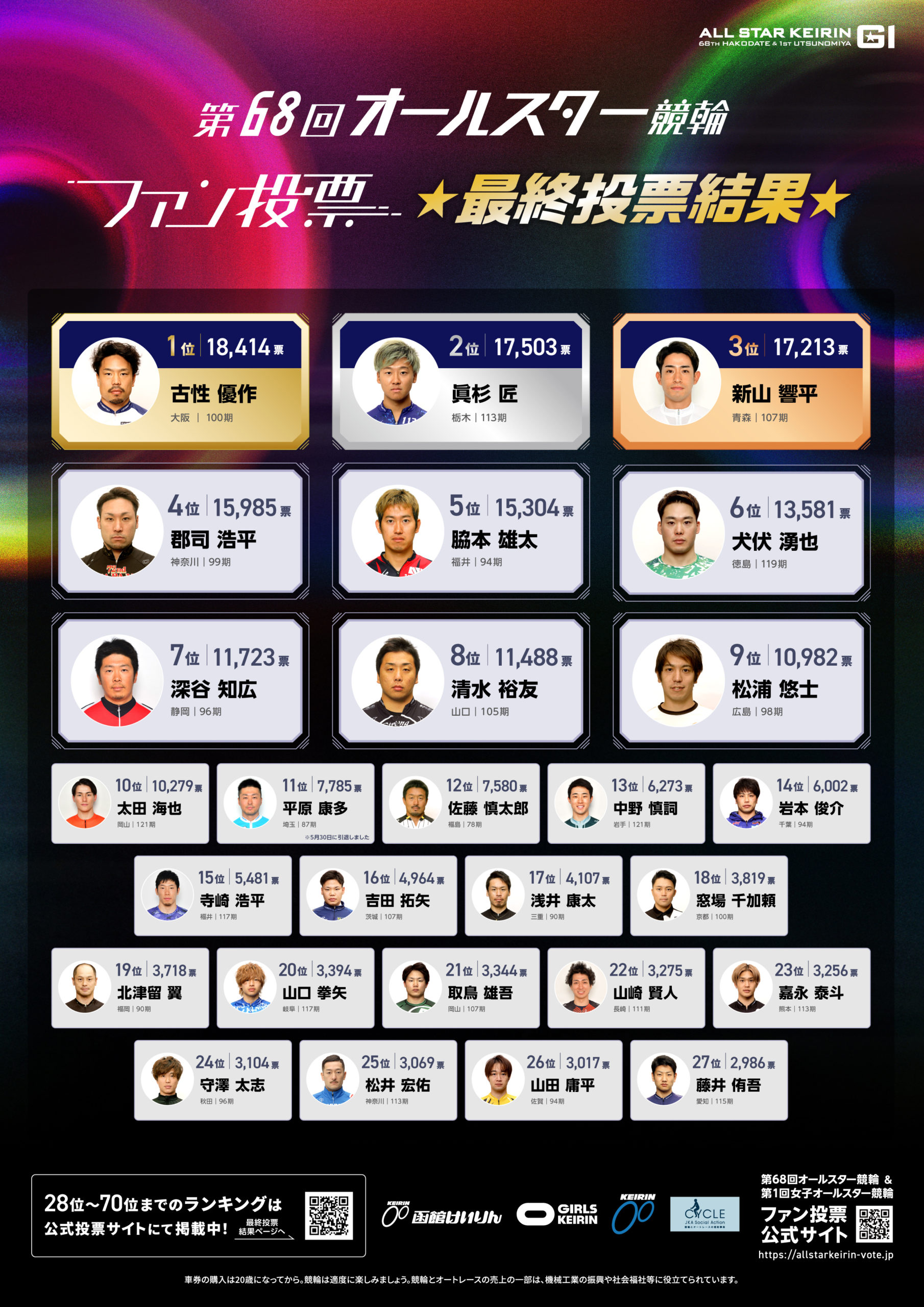 『第68回オールスター競輪及び第1回女子オールスター競輪』ファン投票の最終結果が発表されましたのでお知らせいたします。