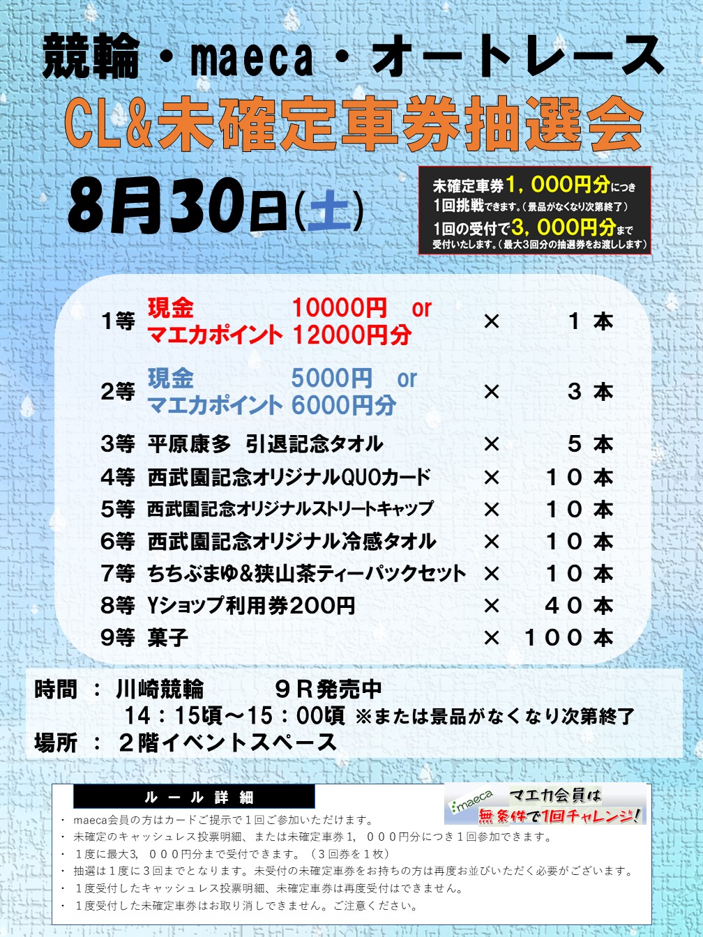 8月30日(土) CL&未確定車券抽選会を開催します!