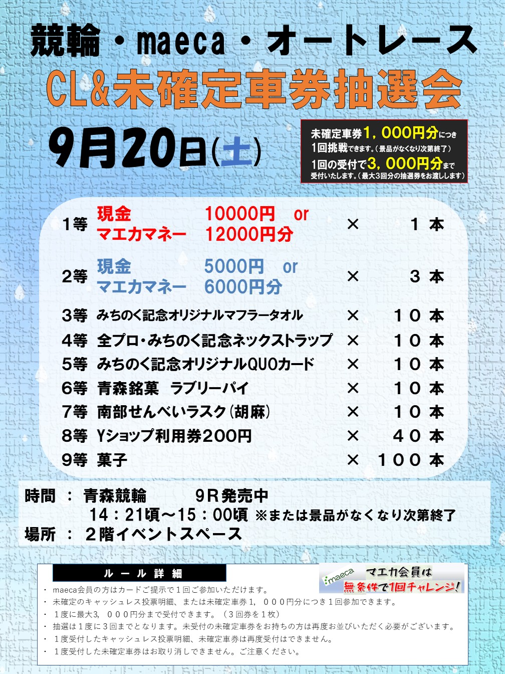 9月20日(土) CL&未確定車券抽選会を開催します!