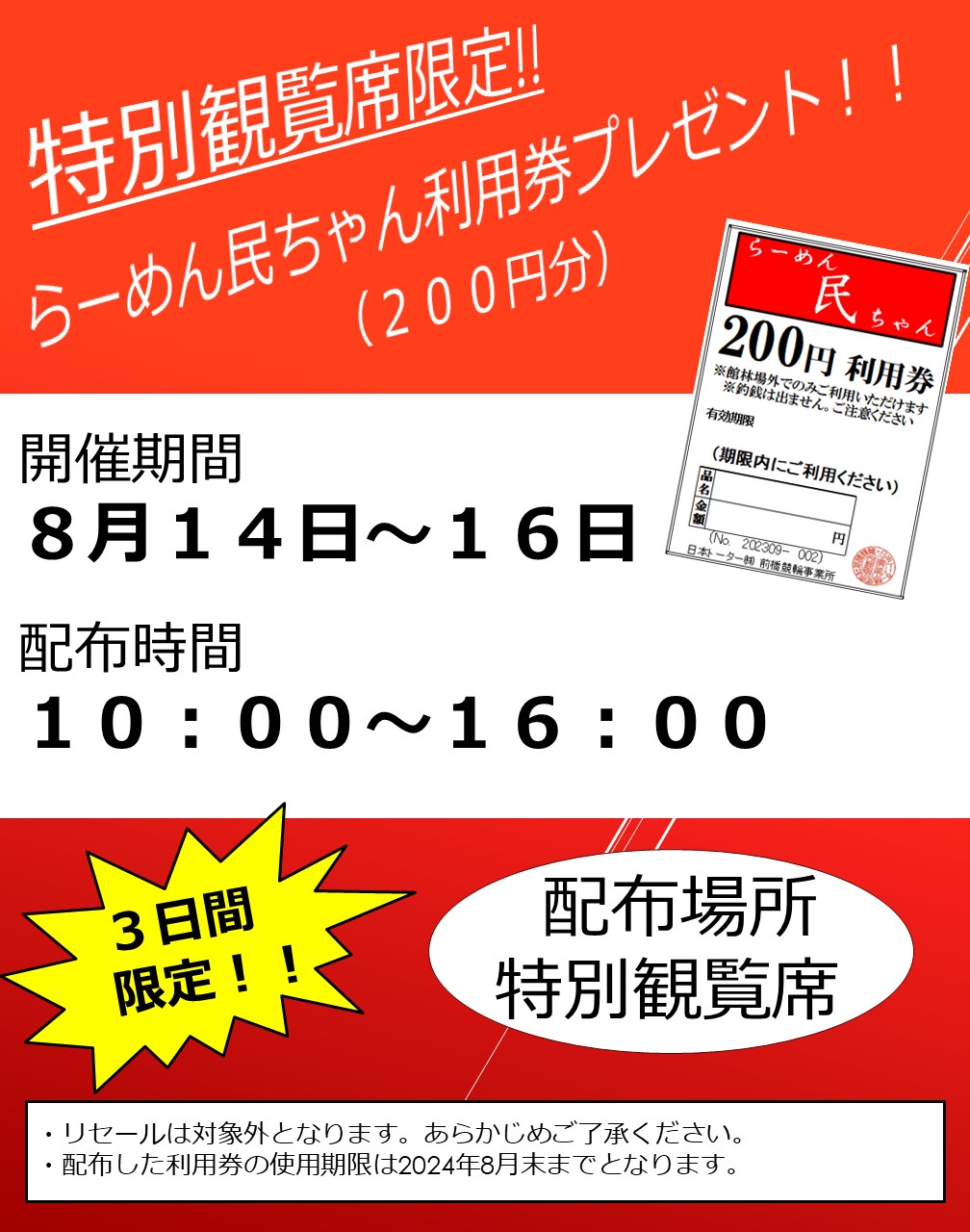 2024.08.07 館林場外終了 特別観覧席限定らーめん民ちゃん利用券(200円分)プレゼント 8月14日~16日の3日間限定で、特別観覧席をご利用いただいたお客様に、 場内のらーめん民ちゃんで使える200円分の利用券を配布いたします。 この機会に是非、特別観覧席をご利用ください。