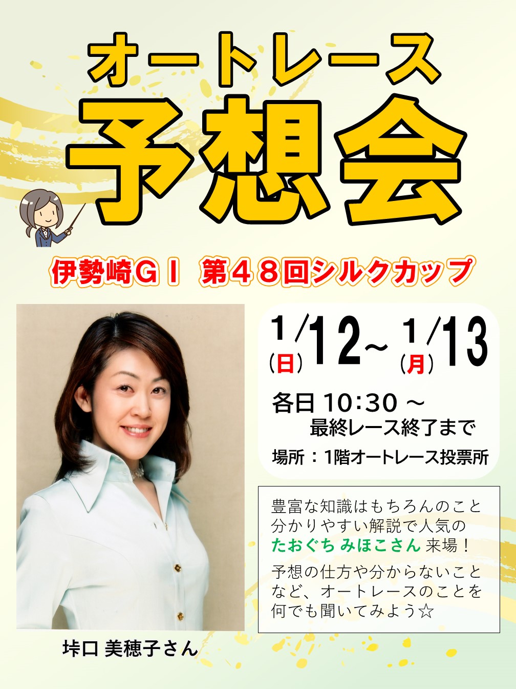1月12日~1月13日の2日間、垰口美穂子さんによるオートレース予想会を実施いたします。