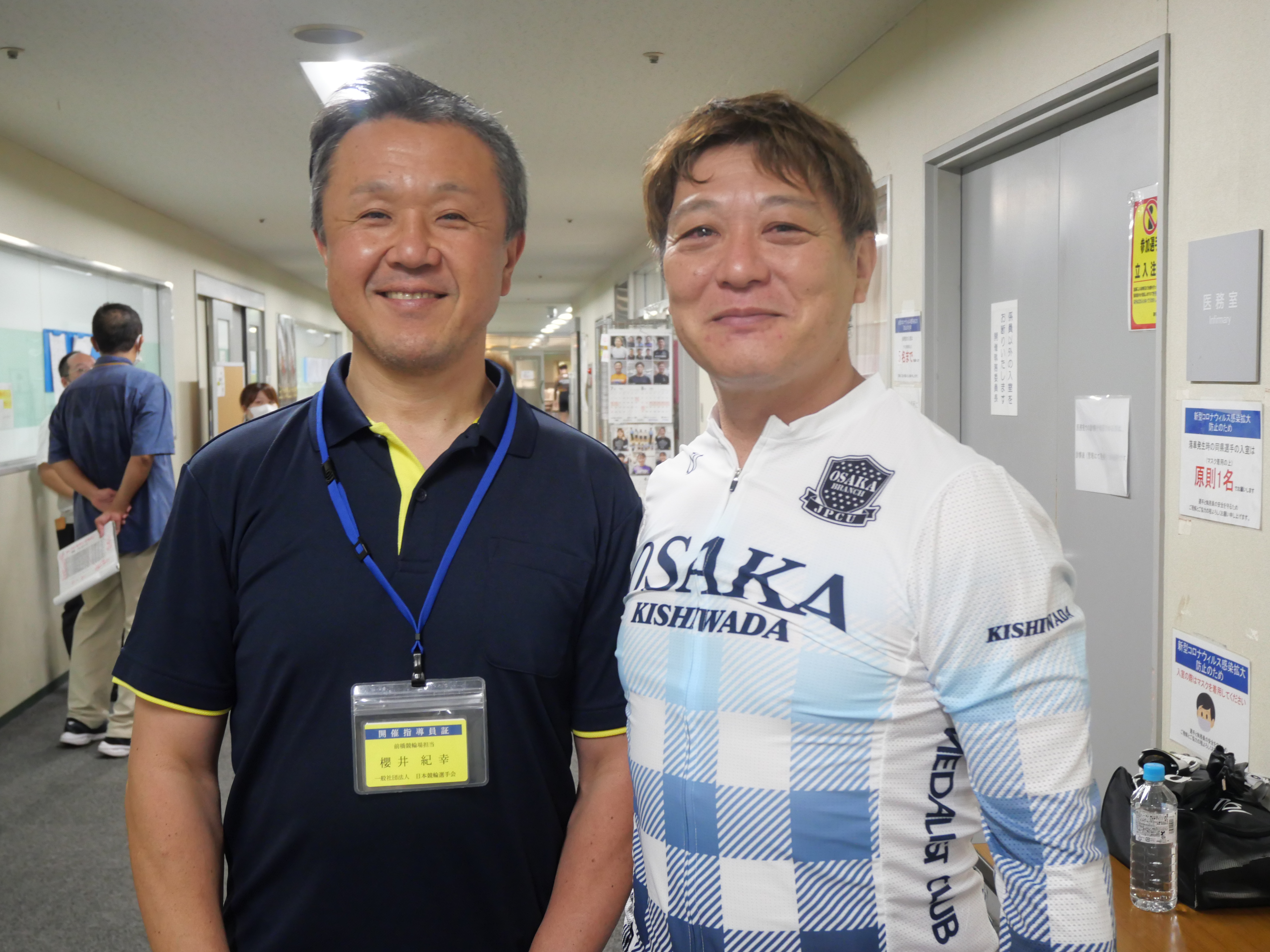 「いつも二日前から出発するルーティンで、今回も二日前の午前中に練習してから午後に出発してきました。キャンピングカーで移動しています。東名高速が通行止めだったけど、中央道を通ってきて、雨もそれほど降らなかったですね。櫻井(紀幸選手・写真2枚目左)と同期なんですよ。一緒に写真撮ってください(笑)。」