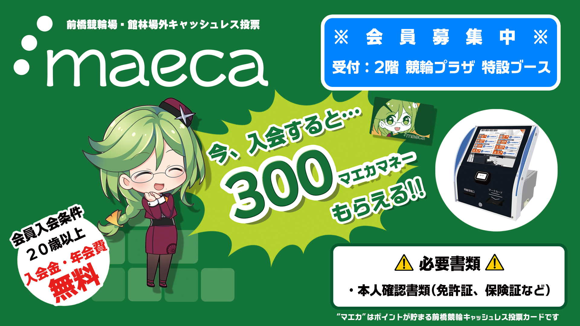 2021年11月18日(木)より、前橋競輪場2F競輪プラザにてキャッシュレス投票『maeca』の新規会員を募集しております。