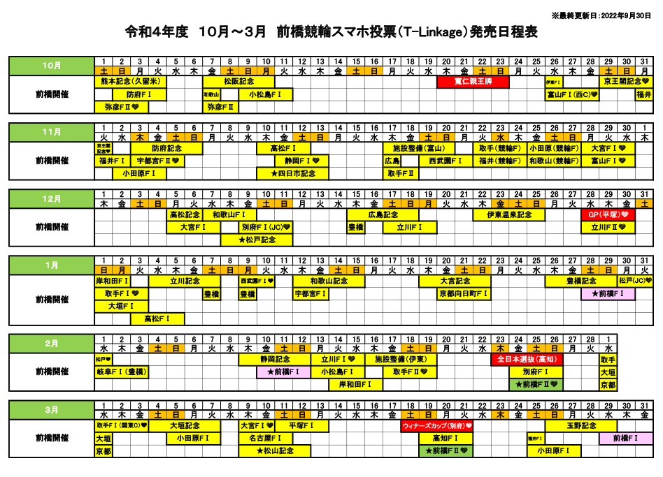 2022.10.02 重要前橋競輪 令和4年度下期 前橋競輪スマホ投票『T-Linkage』発売日程について 前橋競輪スマホ投票『T-Linkage』令和4年度下期の発売場につきましては、添付の画像をご確認いただきますよう何卒よろしくお願いいたします。