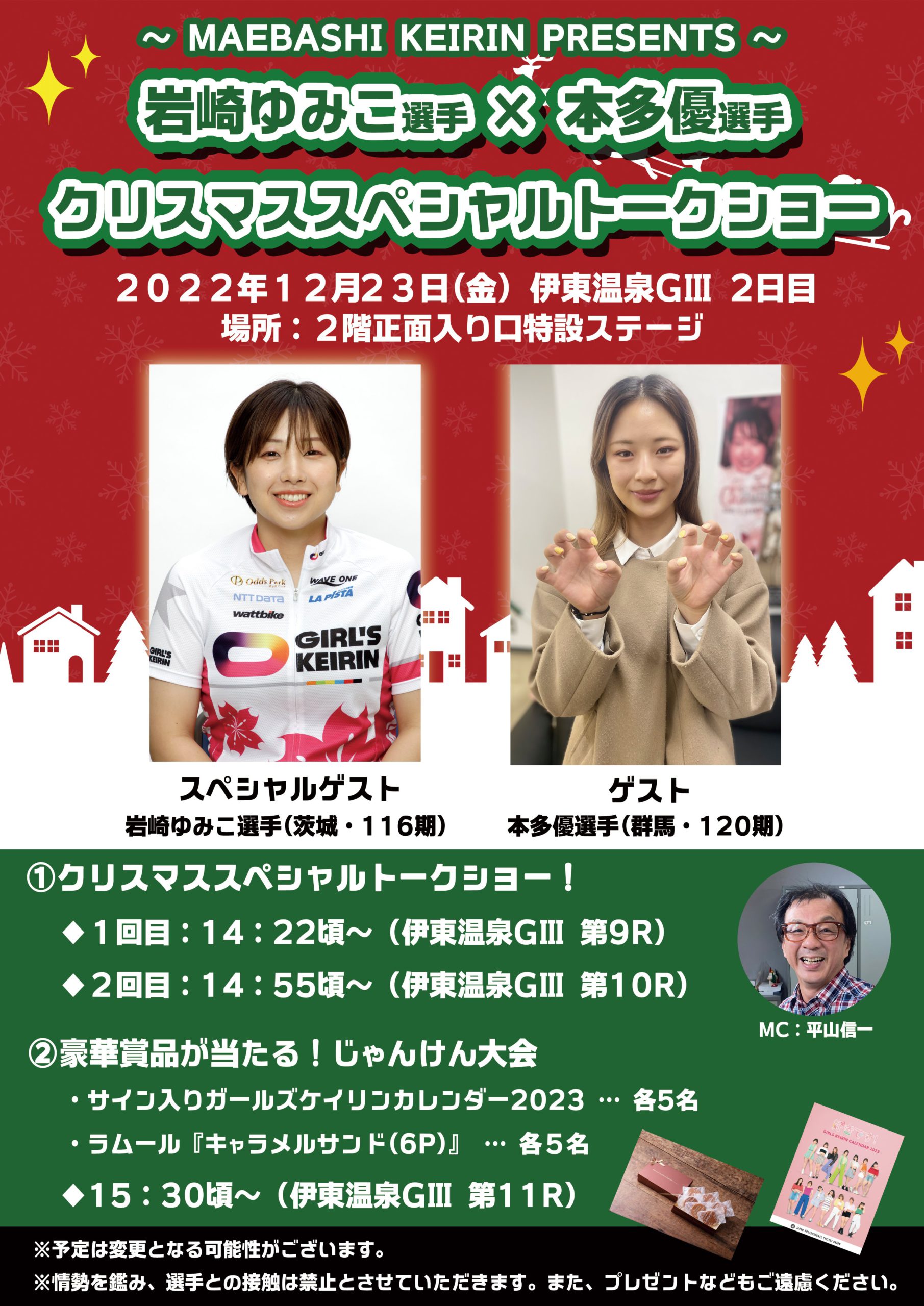2022年12月23日(金)、前橋競輪場にて岩崎ゆみこ選手(茨城・116期)と本多優選手(群馬・120期)によるクリスマススペシャルトークショーを実施します。