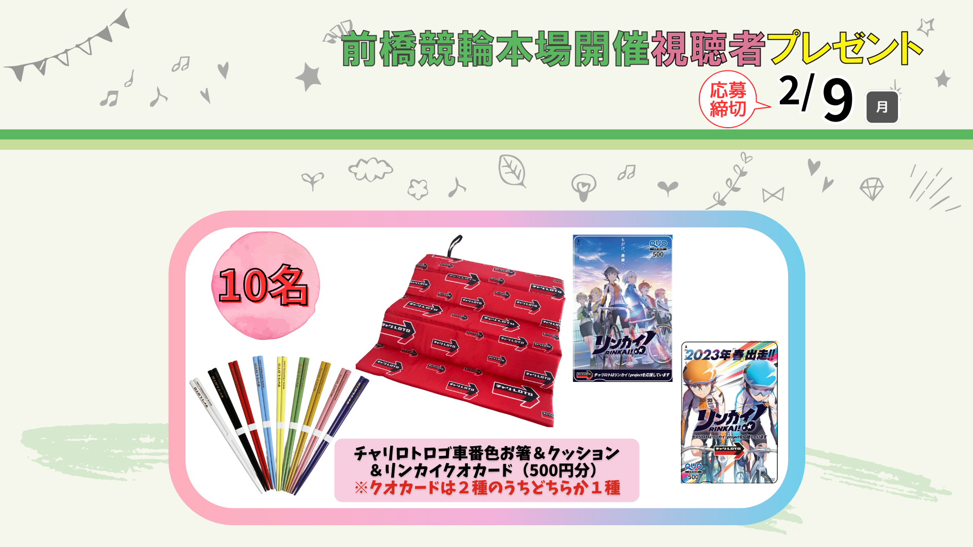 2026.02.06 NEW 前橋競輪 【ご応募はこちらから】2/7~2/9 チャリロト杯 (FⅡ MN ♥) 視聴者プレゼントのご案内! 2026年2月7日(土)~2月9日(月) 前橋競輪 チャリロト杯 にて視聴者プレゼントがございます。 下記リンク内にて、番組放送中に発表されるクイズの解答かキーワードをご記入下さい。 ※賞品の発送をもって発表にかえさせていただきます。 ※応募の際の個人情報につきましては、賞品発送以外の目的では使用いたしません。 前橋競輪 視聴者プレゼントに応募される方は、下記ボタンよりお進み下さい↓