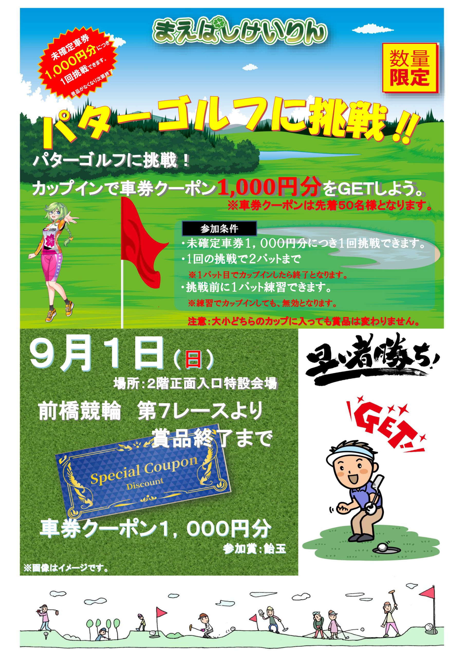 2024年9月1日(日)、前橋競輪場2F正面入口付近にて、車券購入券1,000円分が当たるパターゴルフを実施します!