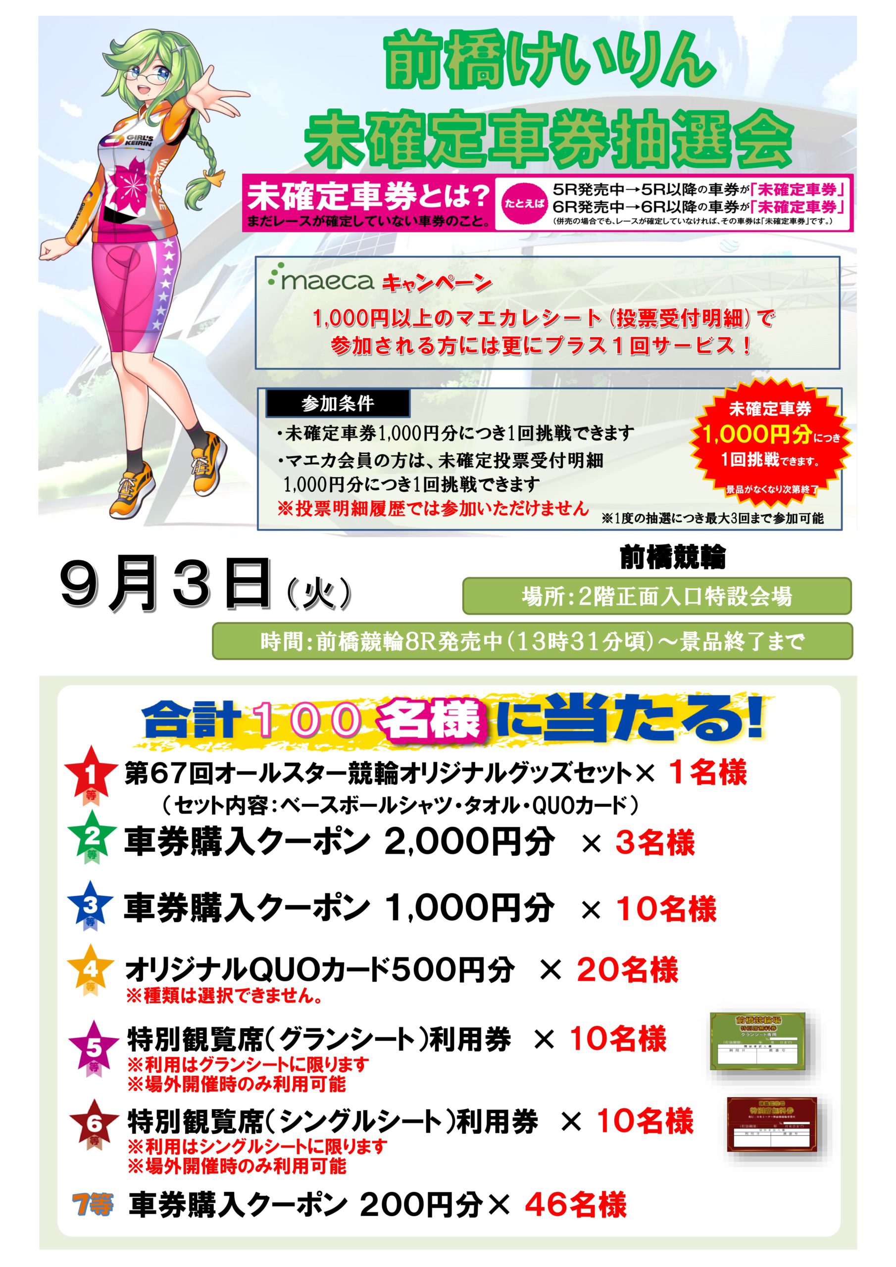 2024年9月3日(火)、前橋競輪場2F正面入り口特設ブースにて、車券購入クーポンなどが当たる未確定車券抽選会を実施します!
