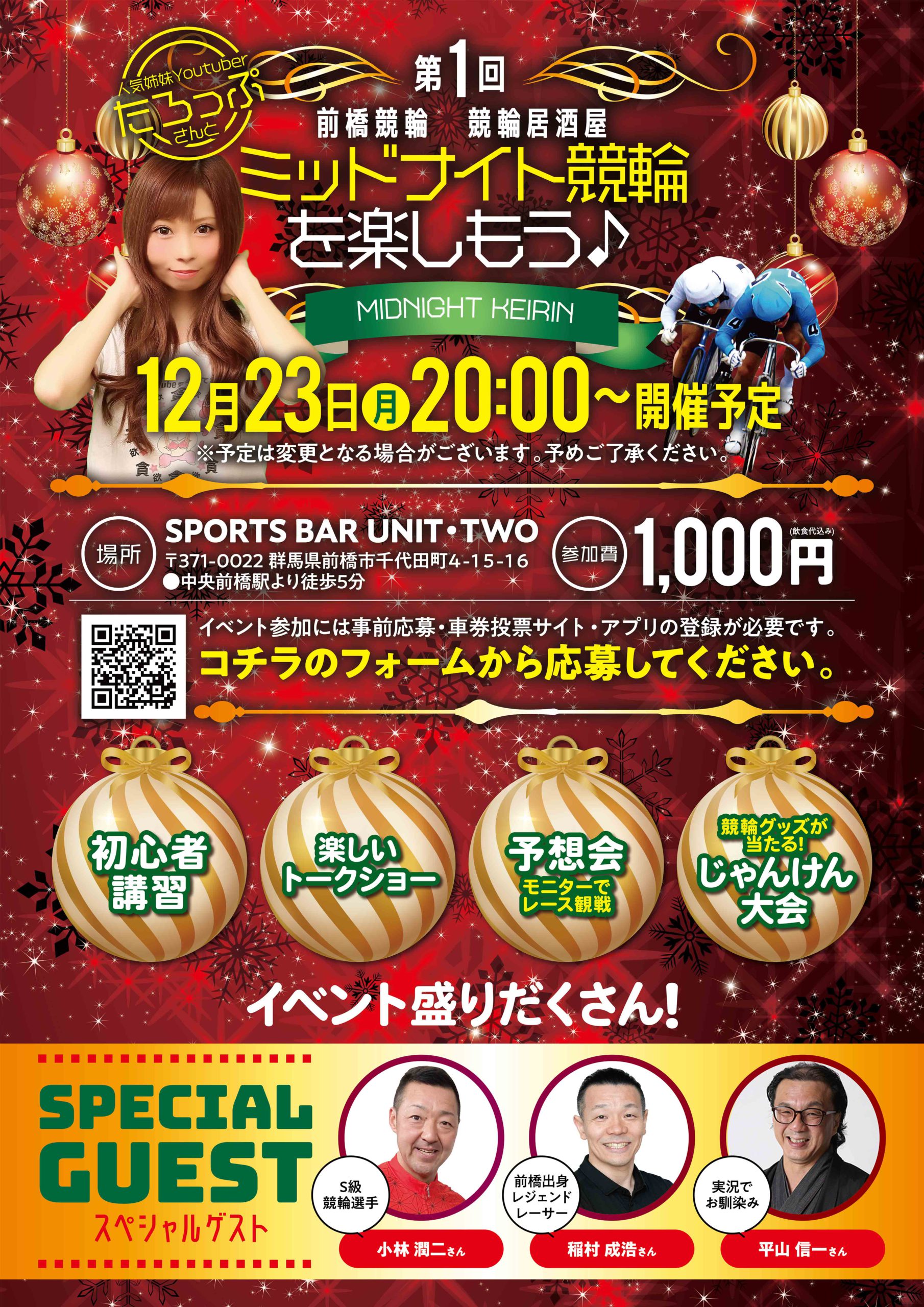 2024年12月23日(月)、『SPORTS BAR UNIT・TWO』にて【第1回】前橋競輪居酒屋を開催いたします!