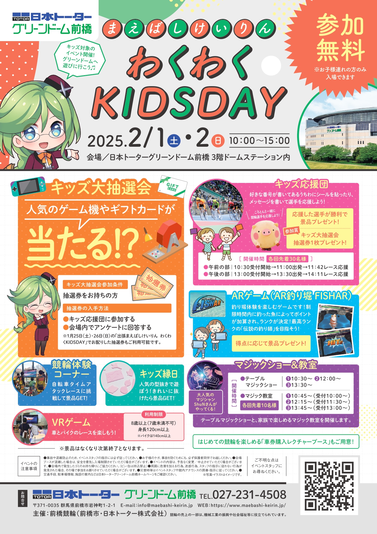 2025.01.26 前橋競輪 2月1日(土)・2日(日)前橋競輪キッズイベントのお知らせ! 参加無料!! 2025年2月1日(土)・2日(日)、前橋競輪場3Fドームステーションにてキッズ向けイベントを実施いたします。 大人気マジシャン『ShuN』さんによるマジックショー&教室や、ARゲームなどイベント盛りだくさん! 更に、キッズ応援団に参加いただいたお子様には、豪華景品が当たる「大抽選会」の抽選券を1枚プレゼント♪ ころとんと一緒に競輪選手を応援しちゃお★ 他、詳細につきましてはチラシをご覧ください。