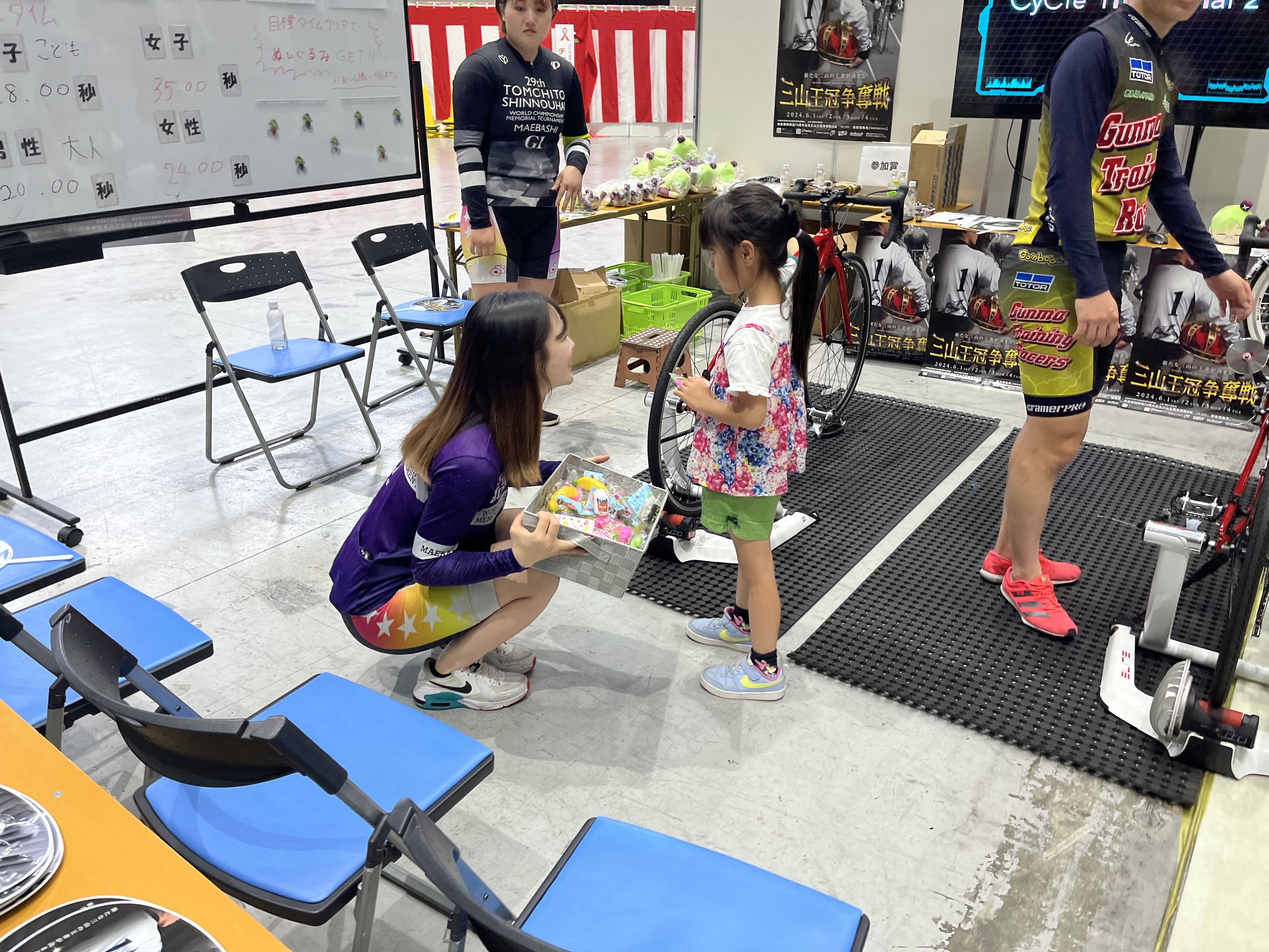 自転車を実際に漕いでもらって、それをテレビに繋げてバンクを走っているように一周漕いでもらうというものです!