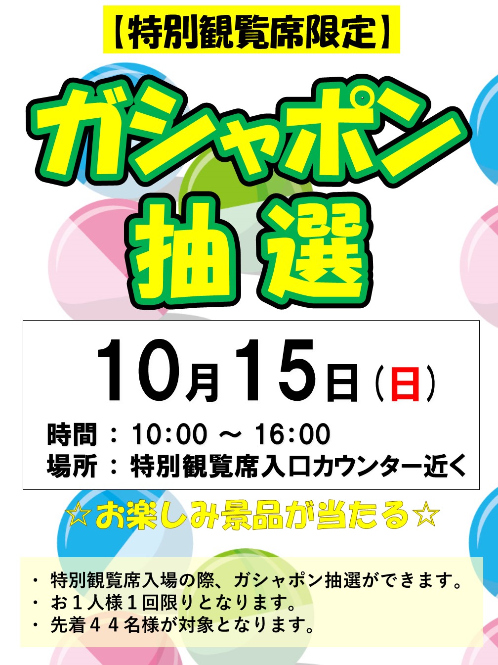 10月15日(日) 特別観覧席限定 ガシャポン抽選会を開催します!