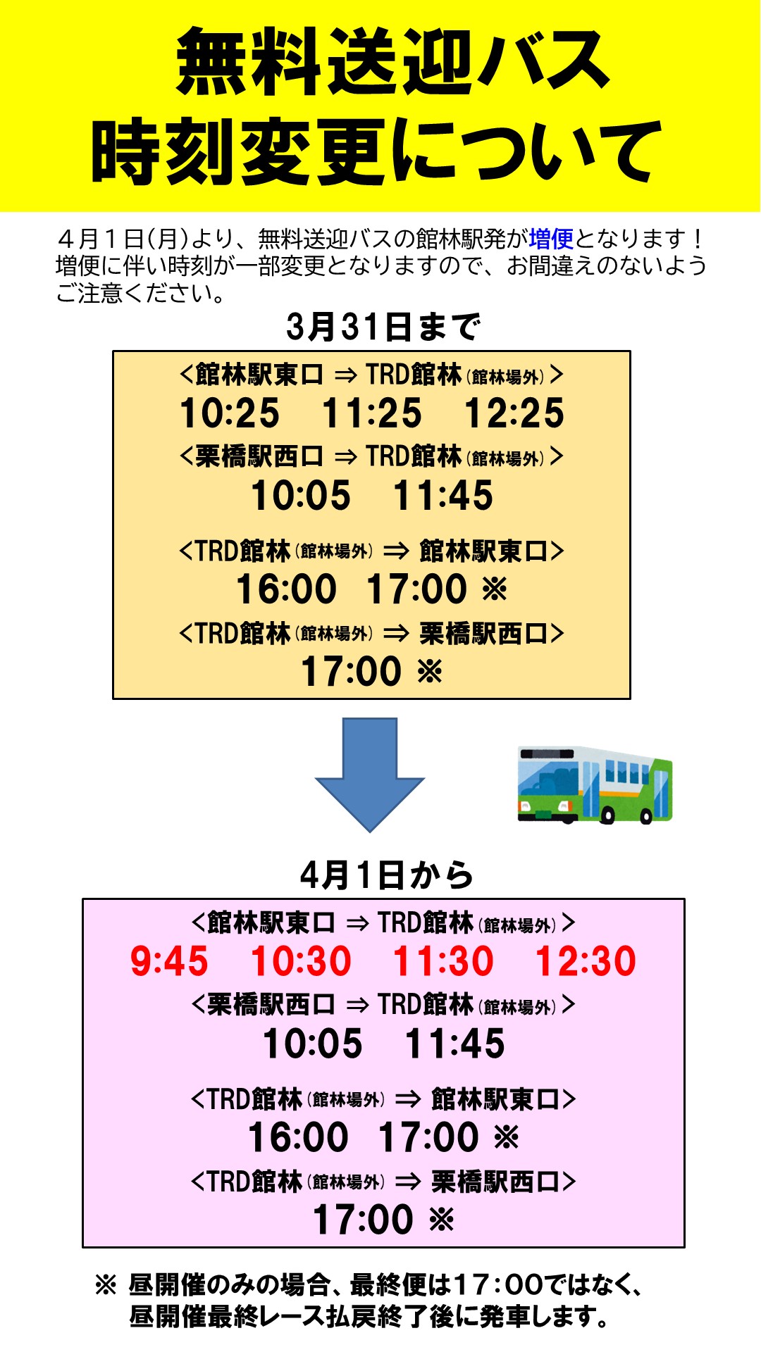 2024.03.28 館林場外重要 館林場外 無料送迎バス 時刻変更のお知らせ 4月1日(月)より、無料送迎バスの館林駅発が増便となります。 増便に伴い時刻が一部変更となりますので、お間違えの無いよう ご注意ください。