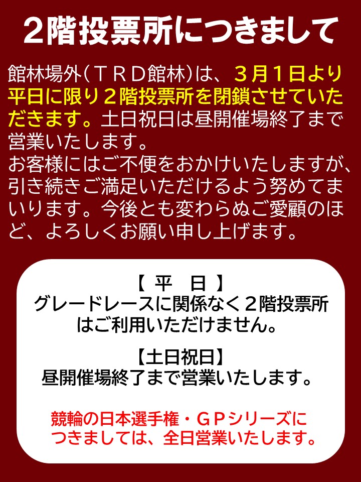 2025.10.01 館林場外競輪重要 2025年3月1日~ 2階投票所平日閉鎖のお知らせ 2025年3月1日より、平日に限り2階投票所を閉鎖いたします。 なお、土日祝は昼開催終了まで2階投票所を開放・営業いたします。 お客様には大変ご迷惑をおかけしますが、何卒ご了承ください。